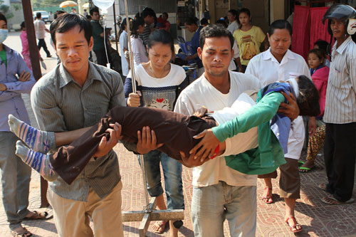 Men carry an injured woman at a hospital after a transport truck carrying about 50 garment workers collided with another vehicle, Wednesday, Feb. 13, 2013. The driver of the truck was killed and dozens were injured. Photograph: Pha Lina/Phnom Penh Post