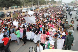 Gladpeer Garment Factory workers protest in Phnom Penh to demand a higher minimum wage. During the first 20 days of this year, employees of at least seven garment factories were on strike. Photograph: Vireak Mai/Phnom Penh Post