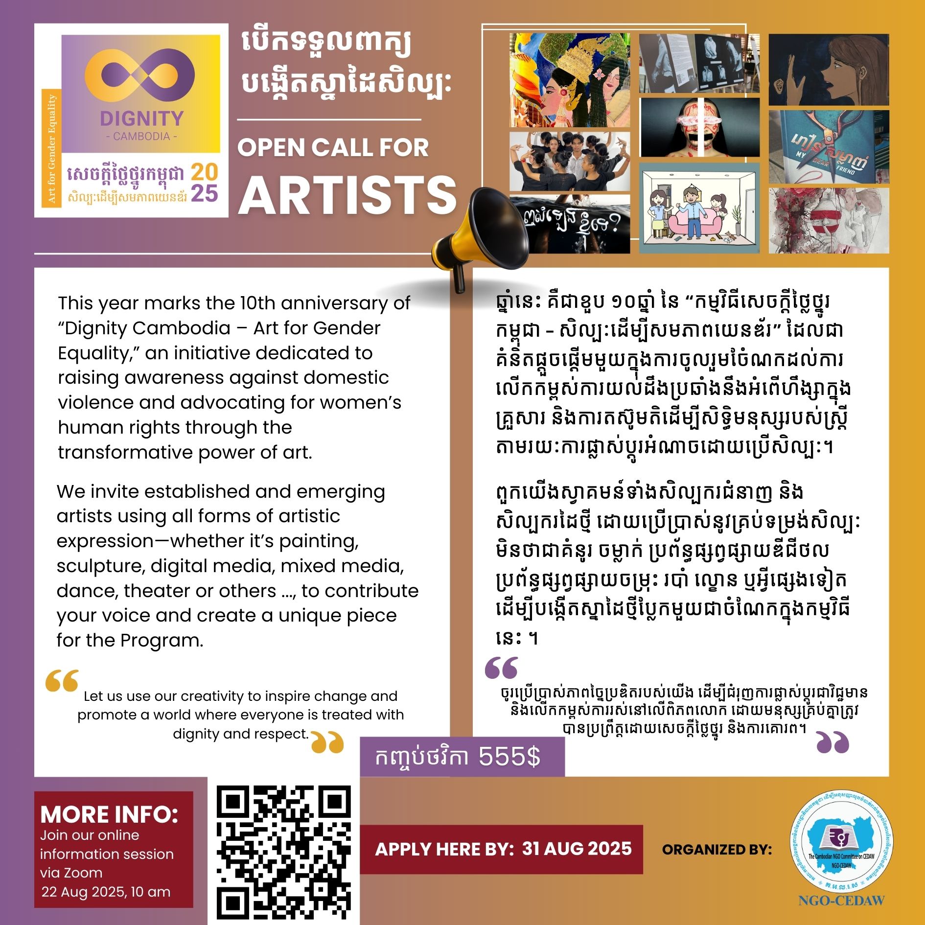 This year marks the 10th anniversary of “Dignity Cambodia – Art for Gender Equality,” an initiative dedicated to raising awareness against domestic violence and advocating for women’s human rights through the transformative power of art. This is why this call goes out to new and previous participating artists of the Dignity Cambodia Project.