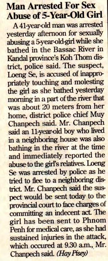 The suspect, Loeng Se, is accused of inappropriately touching and molesting the girl as she bathed yesterday morning in a part of the river that was about 20 meters from her home, district police chief Muy Chanpech said.