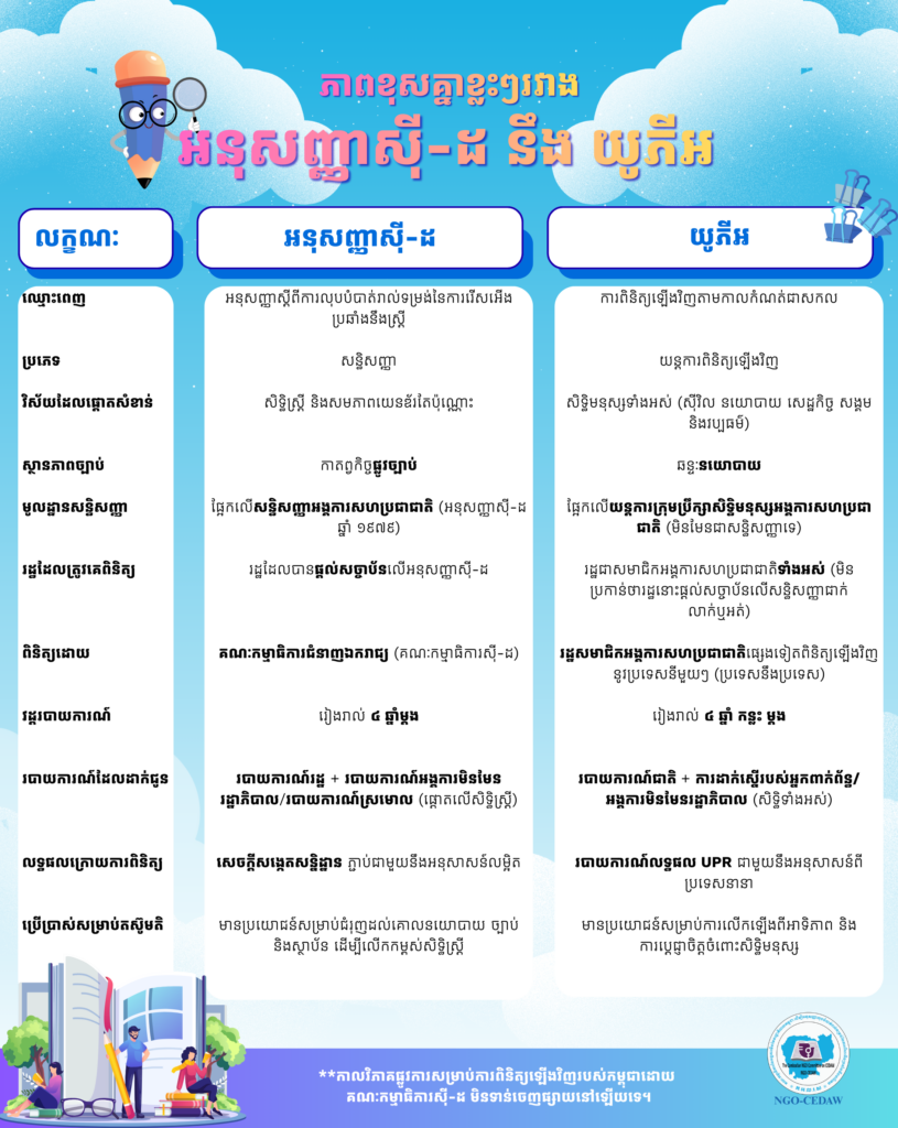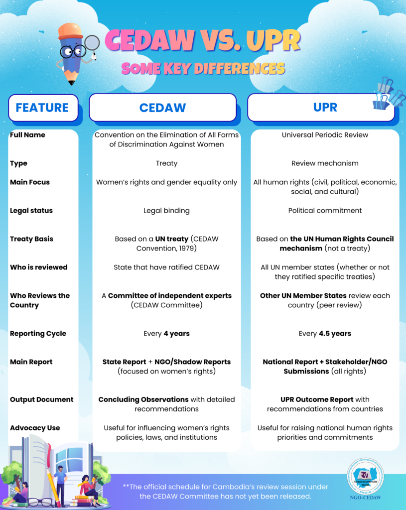 CEDAW stands for th Convention on the Elimination of all Forms of Discrimination against Women, adopted by the UN General Assembly in 1979. The treaty consists of 30 articles and is often referred to as the international bill of rights for women. The countries that ratify this bill are legally bound to follow the articles set out in the treaty and to take action to end discrimination. As of 2026, 189 countries have signed and ratified the Convention, with Cambodia joining on October 15th 1992. Once a country has become a state party, they must submit a national report to the CEDAW committee on the progress they have made on women’s right situation every four years.